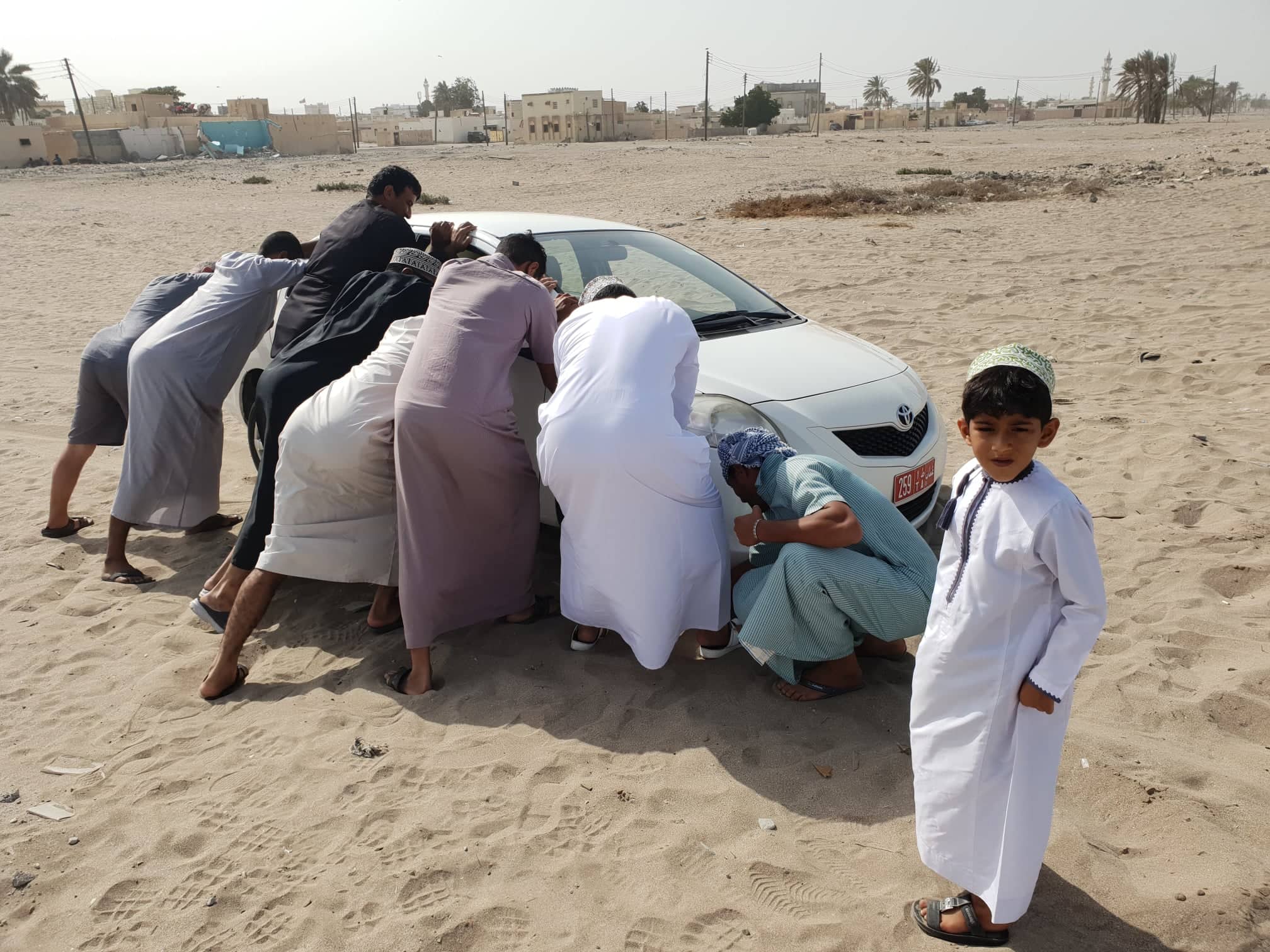 A už se rozjížděl plán jak nás vytáhnout. Jeden s džipem jel na druhou stranu, že nás vytáhne lanem. Všichni byli v bílých sutanách a jeden v černém – a ten to řídil. Šlo se na jednu stranu a auto rozhoupávali, aby se dostal písek pod kola. Potom na druhou stranu a to samé. Jeden vypouštěl z předních kol vzduch. No a po chvílce se podařilo auto vysvobodit s písku. Poplácali se a šlo se dál. To byl asi největší zážitek s Ománu.