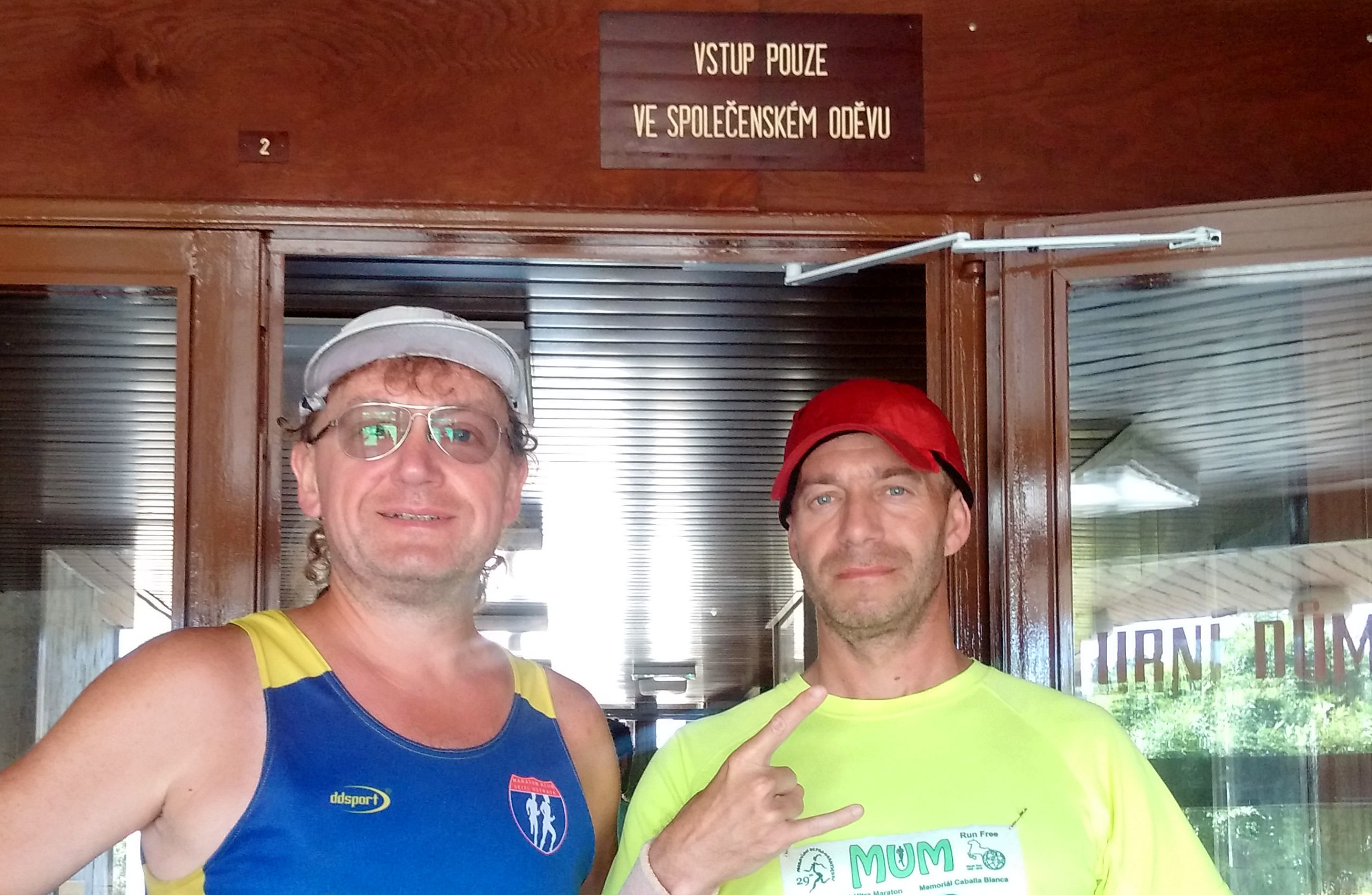 Tady přišla změna, místo seběhu z města po asfaltce, nahoru k hradu a rozhledně, většina na to nadávala, já byl spokojený. Méně ale pak z rekordních čtyř zastávek mezi startem a první občerstvovačkou kvůli značnému zavodnění … Taky se už profilovala skupina s podobnými výkony těm mým: Ivan a Paľo ze Slovenska, Joachim a Stefan z Německa, Dražan z Bosny a Hercegoviny, Petr z Prahy, Gabka – Žabka odkudsi z Čech. Více než čtyřiačtyřicet kilometrů za 5:24:30.